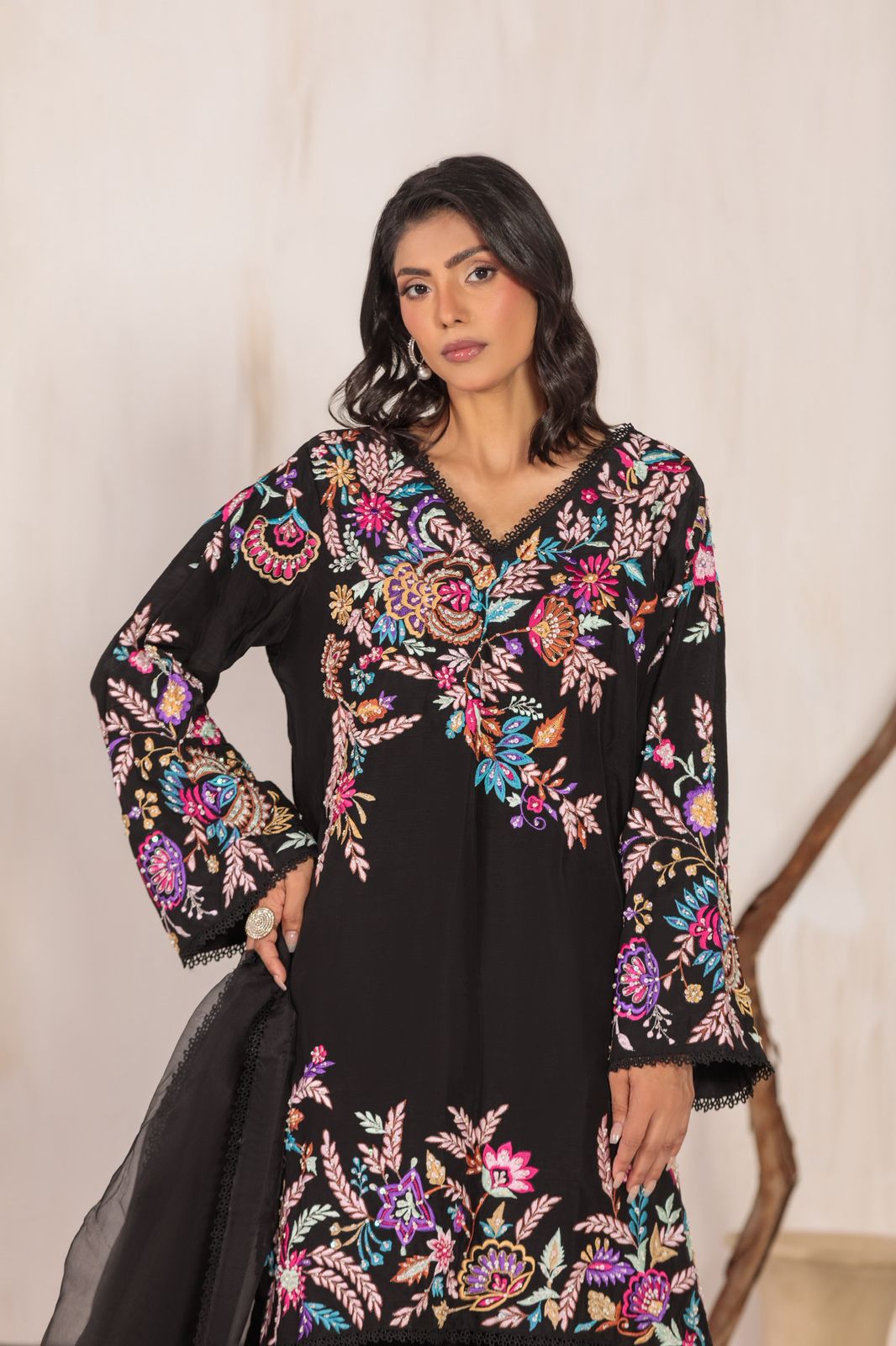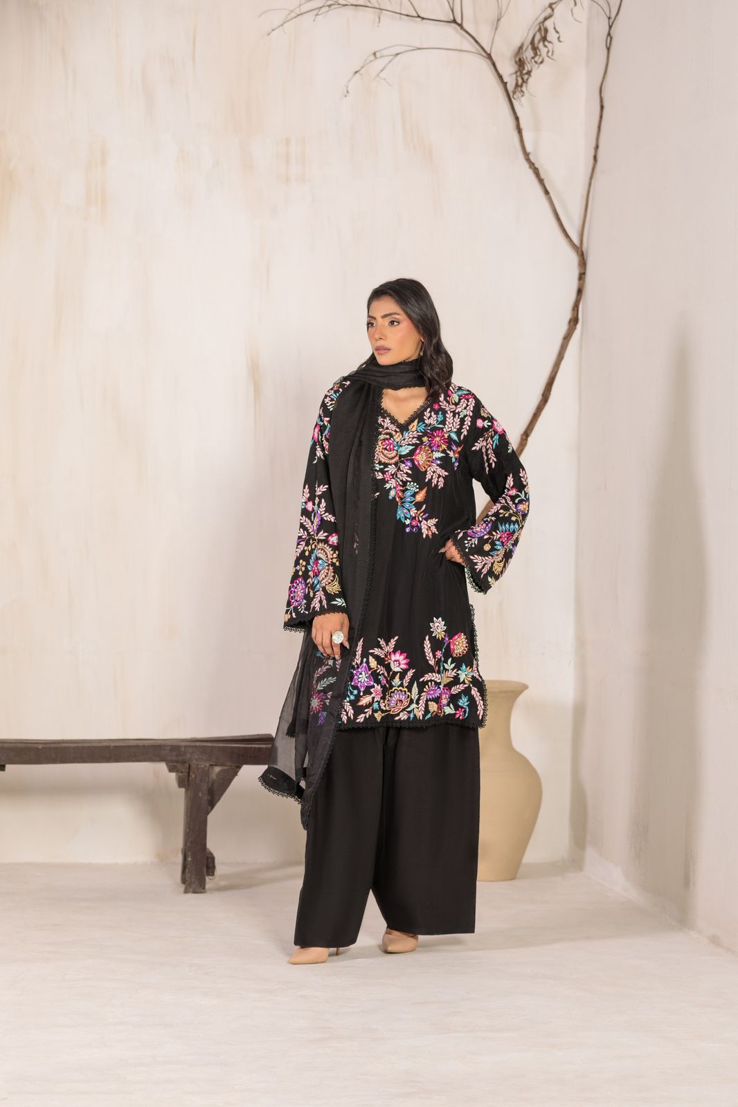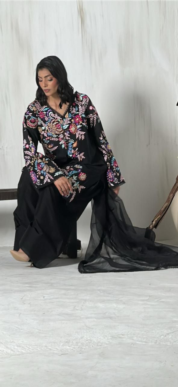Enchanted Garden is a short kameez with Farshi shalwar made on pure raw silk with resham thread...